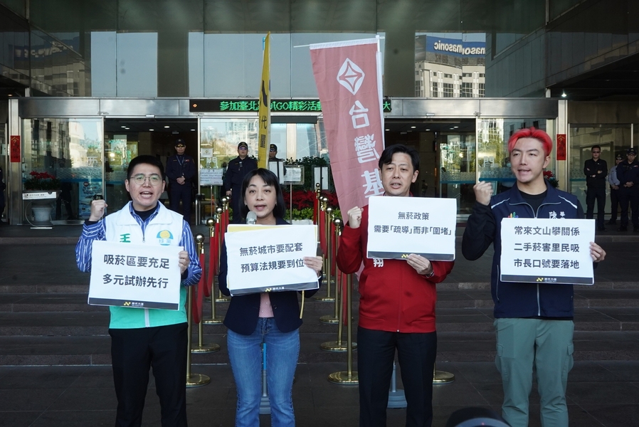 【台灣醒報記者呂翔禾台北報導】「無菸城市只是把抽菸族轉移到巷弄,應該加強配套措施!」時力、基進與綠黨10日於台北市政府門口召開記者會,批評市長蔣萬安推動的「無菸城市」缺乏疏導機制、動線設計也非常不便,且配套的菸灰桶、吸菸區都數量不足。在地里長建議,應恢復校園設置規格化吸菸區,擴編預算增加巡查人力。