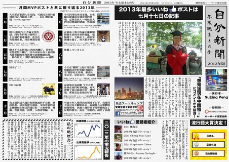 最近一直看到朋友們的臉書上在玩一個叫做「自分新聞」的遊戲(活動?app?)就是登入使用它的app之後,它就會把你過去一年所發生的大事,以及朋友們對你的回應做出整理和統計,形成一個類似報紙的版面,全部的內容...