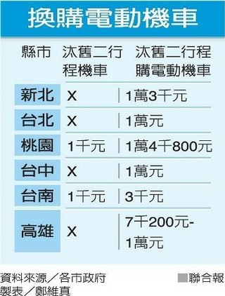 1.二行程換電動機車 南市補助最少 http://udn.com/news/story/7266/1000637 民眾汰換家中老舊二行程機車、購買電動機車,可向各政府申請補助,但台南市補助換購電動...