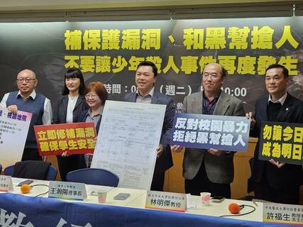 「除了學校不能帶違禁品,司法院應加強問題少年的輔導機制!」國教行動聯盟理事長王瀚陽9日表示,新北國中割喉案顯示中途少年的管理與輔導機制出問題,司法院應儘速回應社會質疑。台灣照顧管理協會榮譽理事長張淑慧呼籲...