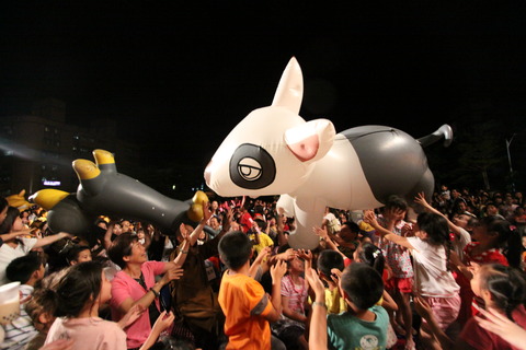黑暗中,身穿黑衣黑褲的幕後人員,操作著五顏六色、活潑跳動的螢光棒,穿梭在舞台上各個不同國家古蹟的圖像,象徵著紙風車劇團前進全世界的決心。 這是紙風車劇團26日下午,準備在5月30日前往中國遼寧省鄉下...