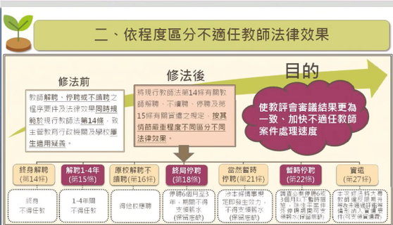 為嚴格加強教師審查制度,教育部師資藝教司司長鄭淵全7日表示,將修教師法明訂不適任教師分級制度,並建議校方在辦理教評會時,應納入校外專家或學者建議,讓案件處理更具公信力。他也說,修法草案也強化教師申訴管道,...