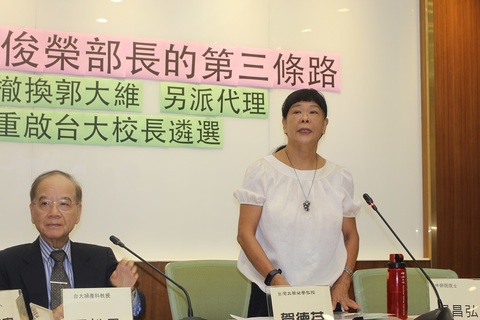 「教育部必須改派代理校長,盡責辦理國立臺灣大學校長重啟遴選!」台大遴選案自去年爆發以後,遲至10日開學都沒有校長已引起社會譁然,台大多位教授包括賀德芬、周松男召開記者會,請教育部依法廢止郭大維擔任國立臺灣...