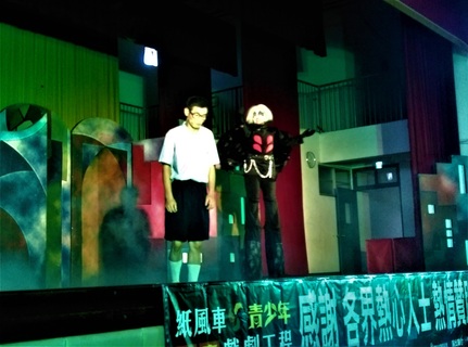 紙風車團員操控著大型充氣偶,象徵毒品侵入青少年生活的魔鬼,現場搭配大量噴霧與震耳音效,讓在場學生看得目瞪口呆。「紙風車青少年教育劇場工程」11日至弘道國中,以煙霧、精彩的特技表演、詼諧逗趣的故事內容,以舞...