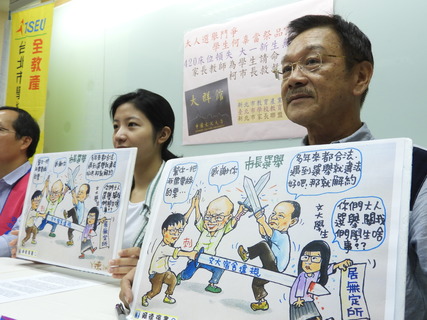 「選舉是大人們的鬥爭,不應拿學生當犧牲品!」台北市政府日前認定文化大學大群館不能當學生宿舍,直接影響400名學生住宿權益。全教產10日陪同文大師生代表召開記者會,理事長黃耀南表示,大群館解約後,新生宿舍中...