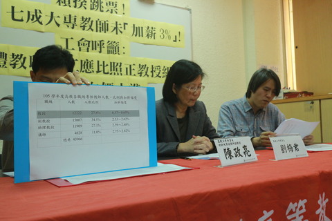 「公教人員全面加薪3%」政策跳票?高教工會27日指出,佔大專院校教師7成的副教授、助理教授及講師,實際調薪額度僅2.6%,批評政府喊出的調薪政策「偷斤減兩」。組織部主任林柏儀受訪時表示,雖然本俸的確有調漲...