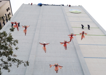11名綠色和平的志工舞者扮演海洋生物與人類,5日在環保署外牆表演垂吊舞蹈,先是在高空遨遊,而隨著繩索越放越低,暗喻生氣蓬勃的海洋生物因誤食人類的塑膠垃圾,漸漸窒息沉寂。環保署長李應元特別出席支持並表示,政...