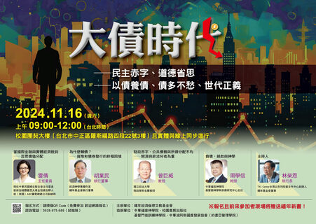 各國面臨債務氾濫,經濟前景充滿挑戰和隱憂,該如何因應?禧年經濟倫理文教基金會11月16日將舉行「大債時代」研討會,針對目前各國債務氾濫,以及金融財政的迷茫,對世代正義和道德之衝擊,進行研討。會中將邀請前新...
