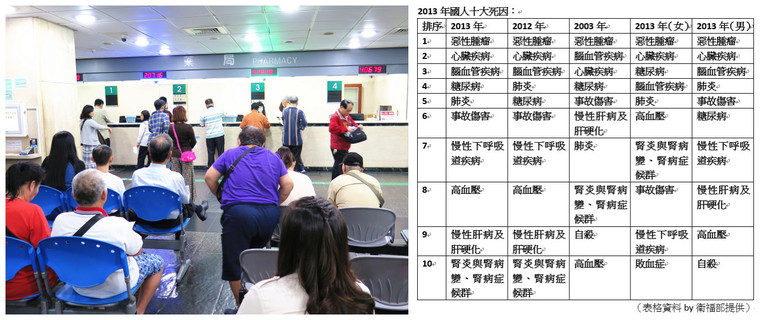 2013年國人十大死因依序為癌症、心臟病、腦血管疾病、糖尿病、肺炎、事故傷害、慢性下呼吸道疾病、高血壓、慢性肝病及肝硬化,以及腎炎、腎病變與腎病症候群,與往年相仿。衛福部統計處指出,十大死因中慢性疾病占6...