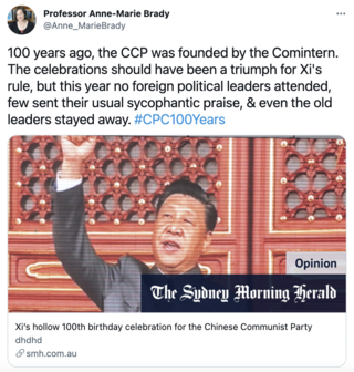 紐西蘭學者疑似因發布嘲諷中共建黨百年的貼文,導致 Twitter 帳號遭暫時性關閉。當事人坎特伯雷大學教授安妮-瑪麗·布雷迪指出,事情可能是起因於她嘲諷中國共產黨百年黨慶的推文,她也對社交軟體透過設定關鍵...