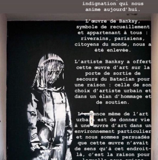 英國知名畫家班克西憑弔巴黎恐攻的畫作26日遭竊!2015年巴黎恐攻後,英國畫家班克西在傷亡最慘重的巴塔克蘭劇院留下了作品,在其逃生門上繪製年輕女孩哀悼的畫像。但巴塔克蘭劇院於26日發布推文表示,逃生門於2...