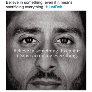 由於Nike邀請抗議種族議題的前NFL球星卡普尼克為新任代言人,曾是唱國歌時單膝跪地發起者的卡普尼克更因種族議題槓上川普,而廣獲球星與娛樂圈藝人的支持,並在推特轉發,使得卡普尼克代言的30週年口號「捍衛信...