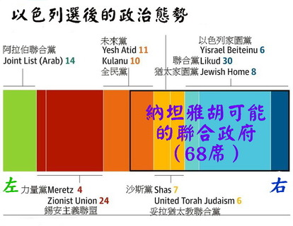競爭激烈的以色列國會大選於18日開票完畢,現任總理納坦雅胡的聯合黨大爆冷門,在120席位國會奪下30席,最主要的挑戰者錫安主義聯盟僅得24席。聯合黨未來將可順利拉攏極右及中間小黨,組成大右派政府。國際社會...