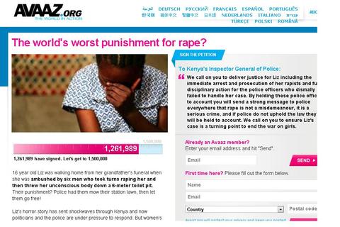 網路群眾運動力量大,超過百萬民眾聲援肯亞遭暴少女。日前肯亞少女莉茲遭6名男子輪流性侵,以致終生半殘,但承辦警員不公,嫌犯只被處以「割草」之刑。當地女權團體憤慨,在《Avvaz. org》請願網站上發起連署...