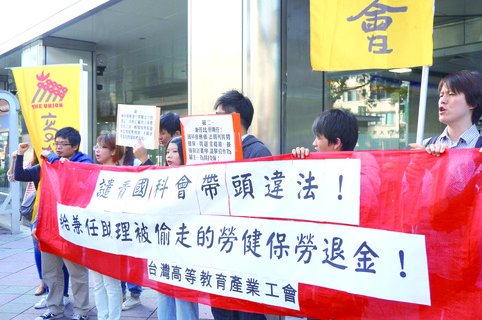 「國科會還我退休金!國科會還我勞健保!」高教工會14日向國科會提出學生兼任助理者應該比照專任助理,依法提撥勞健保的訴求。且該筆款項應獨立設置,不應和業務費混用。國科會綜合發展處副處長彭麗春接受訪問時表示,...