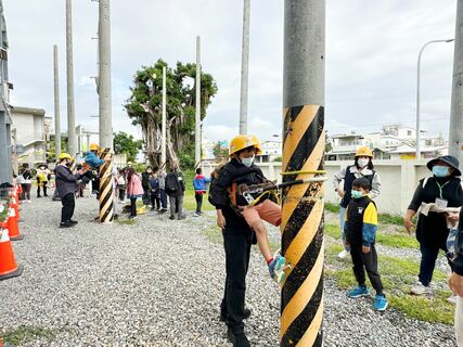 小朋友化身一日台電職人,威風登上電線桿!台東一粒麥子基金會與台電攜手合作17日舉辦「小天使群英會」,帶課輔班小朋友出外完成實境解謎遊戲,讓小朋友認識台電職人的工作,特別開放參訪配電中心,並由員工解密台電職...