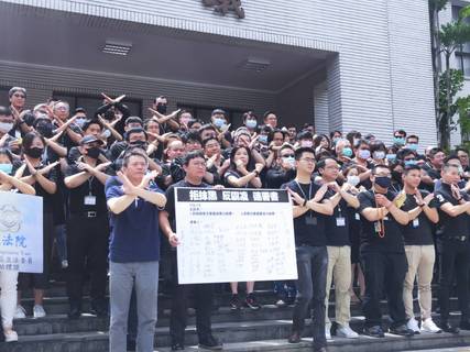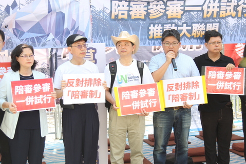 「實施陪審制才有最民主的審議!」民間司法改革基金會、台灣陪審團協會等民團1日在立法院門口舉辦「沒有職業法官也能評議?國內外陪審員現身說法」,呼籲總統蔡英文儘速兌現司法改革承諾,民間司改會董事長林永頌與民眾...