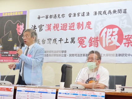 「不管幾審都遇到你,真相怎麼說得清?」財經刑法研究學會、民間司改會、人權文化協會及數名法律學者1日於立法院召開「法官漠視迴避制度」記者會,呼籲政府儘速進行司法改革。台大法學院退休教授陳志龍指出,法官若參與...