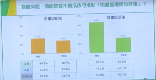民進黨29日公布自家民調,有6成5民眾在接受說明計畫後支持前瞻建設,「與反對前瞻的民調不同,主要差別在『說明』。」民進黨副秘書長徐佳青29日在記者會上解釋。國民黨文傳會副主委胡文琦說,「除非台灣其他的民調...