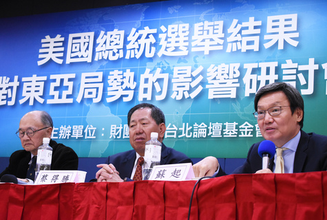「蔡政府應該趕緊找心理學家研究川普!」前國安會議秘書長蘇起在10日一場研討會上如此建議。與會學者都談及川普的貿易壁壘及縮減國安預算等傾向,對亞太局勢有重大影響。中央研究院歐美研究所研究員裘兆琳表示,日韓都...