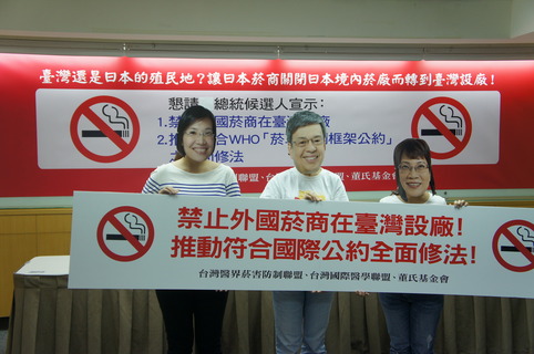 要求候選人重視菸害問題!董氏基金會等民間團體5日召開記者會,要求3位副總統候選人公開宣示,當選後會禁止菸商在台灣設廠、同時會推動符合WHO《菸草控制框架公約》規範的《菸害防制法》。台灣國際醫學聯盟秘書長黃...