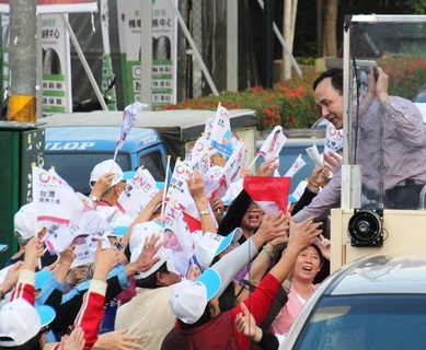 「團結、團結就是力量!」在國民黨副主席黃敏惠帶頭唱歌之下,國民黨總統候選人朱立倫5日前往嘉義市掃街拜票,沿途遇到支持者熱情歡迎,有的站在商店或自家門口,不斷揮舞國旗與競選旗幟,高喊「凍蒜」;有位「嘉義阿嬤...