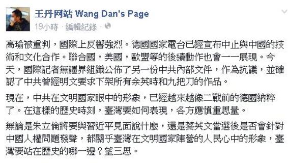 高齡71歲的人權記者高瑜17日因「涉嫌為境外非法提供國家秘密罪」,而被中國判處7年有期徒刑,國外媒體一片譁然,抗議強烈譴責,要求立即釋放或合理審判,台灣媒體卻鴉雀無聲,人權鬥士王丹對國內媒體反應表示失望。...