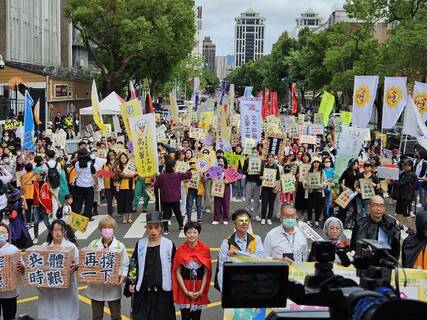 約5百位醫護人員身穿殭屍、科學怪人等服裝,22日下午齊聚立法院門口高喊「人力補足,不過勞」、「安全職場,不煩惱」等口號,呼籲政府重視醫療人員過勞,調整排班以改善護病比、提高放射師薪水與修《職能治療師法》,...