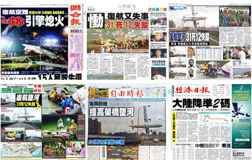 復航墜毀基隆河南港段,造成31死12失蹤,成為5日《聯合報》、《中國時報》、《自由時報》、《蘋果日報》、《台灣醒報》的頭條焦點。 《中國時報》描述了救難人員第一時間進到機艙內的感覺,《自由時報》則著...