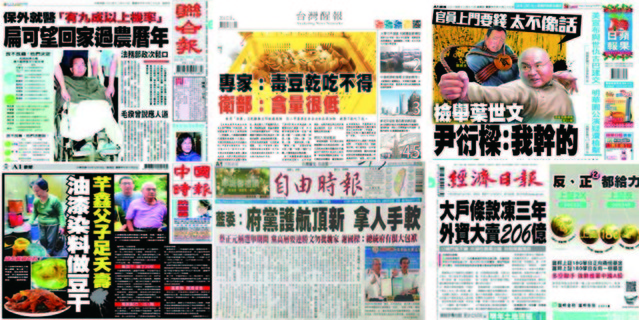 針對黑心毒豆乾,食藥署稱民眾無須擔心因食用而罹癌,《台灣醒報》18日頭版頭條引述專家指出,雖無立即危險,但絕不能吃;《中國時報》頭條追溯二甲基黃來源,芊鑫負責人疑似卸責給上游業者榮美化工。《聯合報》頭條關...