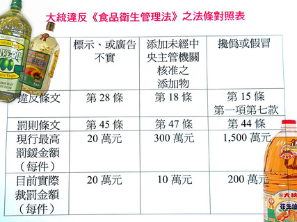 「我們好不容易推動修法提高食安罰則,但政府仍只採最低罰則對大統開罰,那修法意義何在?」消基會23日指出,食用油大廠大統以非食用棉籽油混充橄欖油,犯罪情節重大,已遭勒令停工,但罰鍰卻僅採最低罰則,恐難遏止黑...