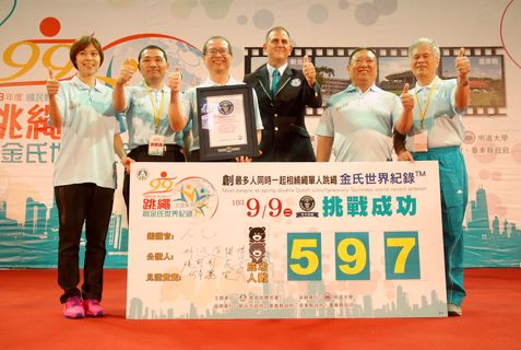 99國民體育日,台灣跳繩創金氏世界紀錄!來自14所中小學的750名小朋友,9日在家長老師的陪同下,挑戰「相繞單人跳」的金氏紀錄,當見證官宣布打破紀錄時,全場歡聲雷動。挑戰者最後還排列巨大的台灣圖形,高喊加...