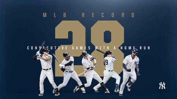 因傷兵過多而被戲稱4A打線的洋基隊,轟破大聯盟連續全壘打紀錄!過往最長紀錄是2002年由遊騎兵寫下的連27場團隊開轟,而洋基面對藍鳥三連戰首役就追平紀錄,26日更由開路先鋒勒梅修首打席就開砲,正式將連場開...