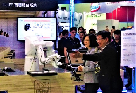 總統蔡英文親自在螢幕上點選可樂,PMC的智慧吧台機器人流暢地開瓶蓋、倒飲料立即奉上!台灣機器人與智慧自動化展於29日盛大展開,集結國內外157家智慧機器人業者,服務型機器人和智慧無人搬運設備成為現場焦點。...