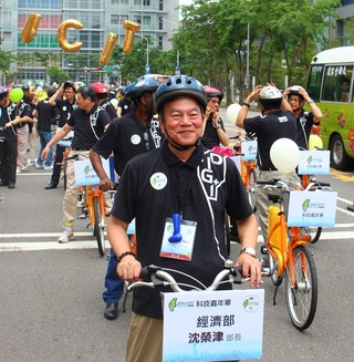 經濟部部長沈榮津身著咖啡渣再製的環保運動服,率領Youbike車隊為世界資訊科技大會造勢加油!為了拉開2017世界資訊科技大會序幕,世界資訊科技大會執行會10日特別舉辦「科技嘉年華」,並邀請新任經濟部長沈...