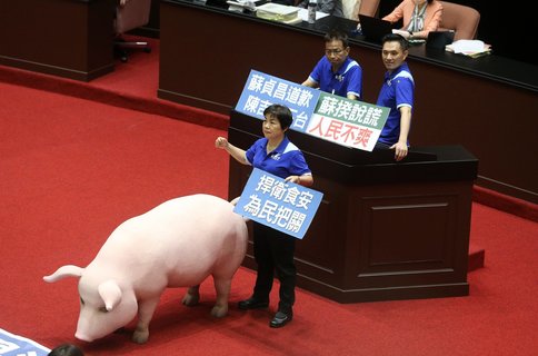 在民意強烈的反彈下,立法院經朝野協議同意將開放含萊克多巴胺美豬進口的有關的行政命令由備查改為審查,並交付立法院五個聯席委員會審查,民進黨黨團書記長還放話:「不怕你審,就怕你放著不審!」。 ##藍營把...
