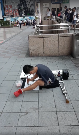 台北市中心忠孝西路百貨公司前,有著熙來攘往或者等候公車的人潮,對比這位「席地」而坐的身障人士,顯得有些唐突,但並未引起太多過往人們投以關注的眼光。 仔細看這位身障朋友,只有右手和左腳健全,卻寫得一手...