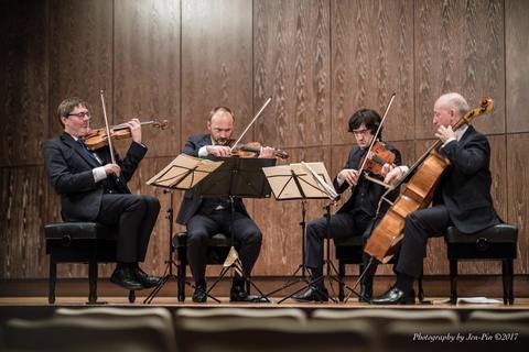 有如現代合音天使,丹奈爾四重奏20日晚間在台北國家演奏廳起奏,並展開為期6天馬拉松式演出,帶給台北樂友天籟級的享受。 這4位音樂家難得以同款式3件式西裝,加灰領帶裝扮,個頭兒由左到右,高矮情況正如下...