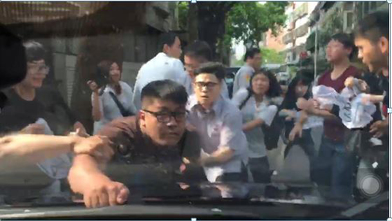 板橋大觀自救會成員20人,4日到行政院長林全的住家附近抗議。當時林全正要驅車前往行政院辦公室,但因車隊遭到包圍,無法動彈,一直到警方到場排除後才脫困。 自救會抗議民眾用交通錐丟擲林全座車,除了讓車子...