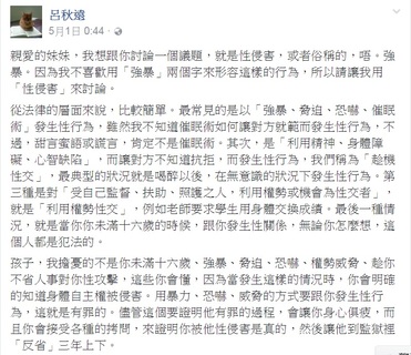 女作家自殺身亡之後,呂秋遠律師曾寫一篇告訴女兒如何面對「性」的文章,引起很多人按讚轉貼。我覺得一開始呂律師的分析很好,特別指出強暴、脅迫等方式性侵還不是最可怕的,更可怕是孩子被所熟識、崇拜的大人用外表溫柔...