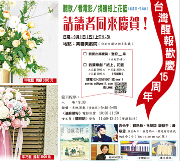 台灣醒報於9 月1 日上午舉行15 周年感恩活動,承蒙媒體界、教會界、政界、學界與社福人士在颱風天踴躍出席,或致贈賀禮、或惠勉有加,令同仁甚為感念,更有決心與力量,倚靠上帝的恩惠,向第16 年邁進。