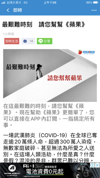 昨天上午閱讀蘋果日報時,忽然一個標題跳出來:「最艱難時刻,請您幫幫《蘋果》?」(見圖)當然,這是《蘋果日報》的訂閱廣告,只是稀奇的是,一向以搧情取寵大發利市的媒體,居然也到了辛苦叫窮的時刻。(其實蘋果幾個...