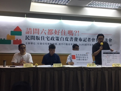 「請六都市長針對民眾買不起、租不起,甚至租不到住宅等問題,提出完整的改善政策!」社會住宅聯盟15日召開「請問,六都好住嗎?」記者會,與多家民間團體撰擬並公布「民間版住宅政策白皮書」,向台北、新北、桃園、台...