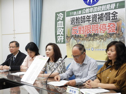 公教年金改革將於7月1日上路,但涉及舊制過渡到新制的退休教師,政府有額外撥補年資補償金,並規定在一年內發放完畢。立法院國民黨團14日召開記者會指出,若老師想拿這筆錢,就必須趕在明年6月底前退休,立委憂心教...