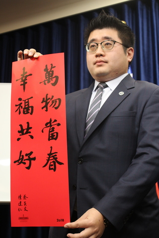 為與民共同迎接狗年,總統府22日公布今年春聯與紅包樣式,春聯題字「萬物當春,幸福共好」,其中「萬物當春」取自台灣詩人賴和於1914年所作〈甲寅元旦〉的詩句;紅包袋口則以狗的雙耳造型設計,貌似向大家打招呼。...