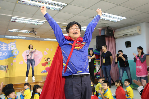 穿上胸口有斗大S字母的藍色上衣、披上火紅色的披風,疾病管制署署長周志浩22日,化身為保護民眾的防疫超人,前往台北市立萬華幼稚園,宣導學齡前幼童流感疫苗接種。 每年秋冬之際為台灣流感好發季節,並在農曆...