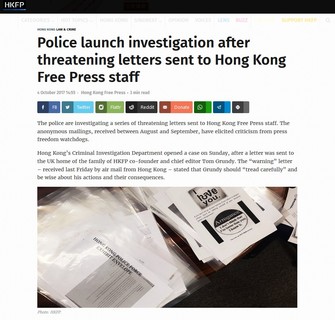 香港新聞自由再受挑戰!香港英文網媒Hong Kong Free Press(HKFP)過去兩個月多次接獲恐嚇信,指控該傳媒分裂香港及中國大陸,更有信件越洋寄往創辦人兼總編輯Tom Grundy住在英國的家...