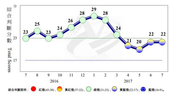 國家發展委員會28日公布台灣「7月份景氣概況」,7月景氣對策信號仍是「趨弱的」黃藍燈,分數與上月持平,維持在22分,也是自4月以來的第4顆黃藍燈。但國發會表示,整體而言,7月景氣比6月好,第三季有機會看見...