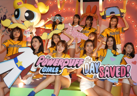 「迷人的花花、可愛的泡泡、帥氣的毛毛~迷人的力量、帥氣的的化身!」中信兄弟啦啦隊「Passion Sisters」17日身穿黃色隊衣搭配白色短褲弧形排開,為「飛天小女警特展」打造專屬口號。啦啦隊女孩們到特...
