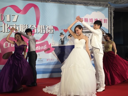 「請新娘、新郎互相交換信物!」新北市政府14日宣布今年聯合婚禮走「郵輪派對」風,除提供每對新人「新北傳奇金鏟子」等10大好禮,還將加碼抽出6對新人公主郵輪蜜月旅行。現場邀請3對新人在市府大廳現場互相交換信...